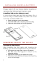 INSTALLING CARDS & B ATTERY Please switch off your device before inserting or removing the SIM card and memory card. Installing SIM card or Memory card In your phone there are two SIM card slots; Sim 1 slot can only use Micro SIM card, while sim 2 slot can only use Nano SIM card. Open the battery cover and battery. Insert the SIM card or memory card correctly. Push the SIM card to the correct position.