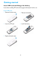 Getting started Insert SIM card and Charge the battery Learn about installing SIM card and charging the battery for the first use. Insert SIM card 1 Remove the back cover. 2 Take out the battery. 3 Insert the SIM card. 4 Install the battery. 5 Replace the back cover.