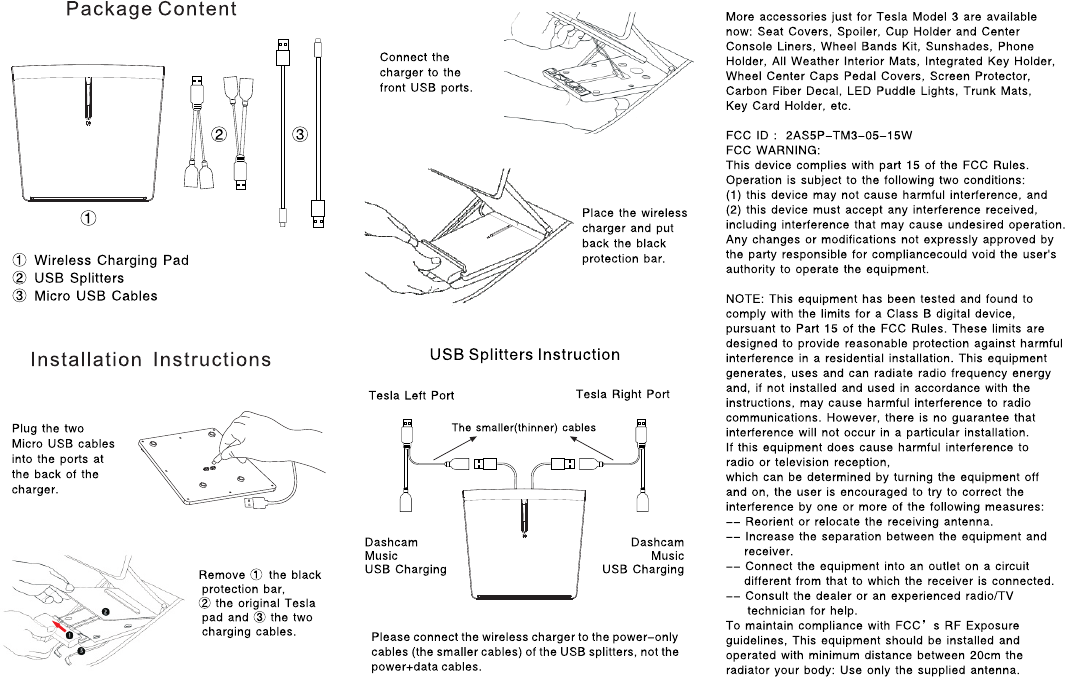 Package Content © @ Wireless Charging Pad @ USB Sp litters @ Micro USB Cables Installation Instructions Plug the two ro USB cables Into the pins at the back of the charger. Remove ( the black protection bar, @ the original Te pad and @ the two charging cables. Connect the charger to the front USB ports.