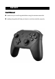 1.Pack Contents 1 x Switch controller 1 x 1.2M Charging Cable 1 x User Manual 2.Products Features Wireless Controller for switch. Includes 4 LED indicators to indicate the connection port(player number)and the battery low power status. Sleep function,automatic power off. 600mAh rechargeable battery pack,it is charged using the type-C plug in the controller.
