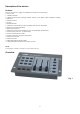 Description of the device Features The LED Operator is a light controller from Showtec and features: • Easy to use • 3 DMX Channels • 9 preset colours (Red, Orange, Yellow, Green, Cyan, Blue, Purple, Magenta, White) • DMX-512 • Strobe function • Chases • Master Dimmer • 3 faders to control Red, Green and Blue LED of your LED fixture. • Manual or sound-controlled • Built-in microphone.