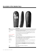 Description of the Handset Keys Key Description Four soft keys Menu These keys are context sensitive and perform the operation described on the display directly above them. Activates the idle or active menu. Pressing it during a menu escapes one level up from the menu. Pressing and holding menu for over one second completely escapes out of any menu. L1, L2, L3, and L4 Speaker icon Line keys with LEDs. Speaker key with LED. Keypad keys (0 to 9, *, #) Used for dialing or data entry.
