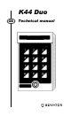 K44 Duo Technical manual 3 What is K44 Duo? .................................. 4 The keypad............................................. 7 Wiring ..................................................... 8 Programming ....................................... 10 Buzzer and LEDs............................... 10 Choose password .............................. 11 Change password .............................. 11 Program codes .................................. 12 Erase codes.......................................