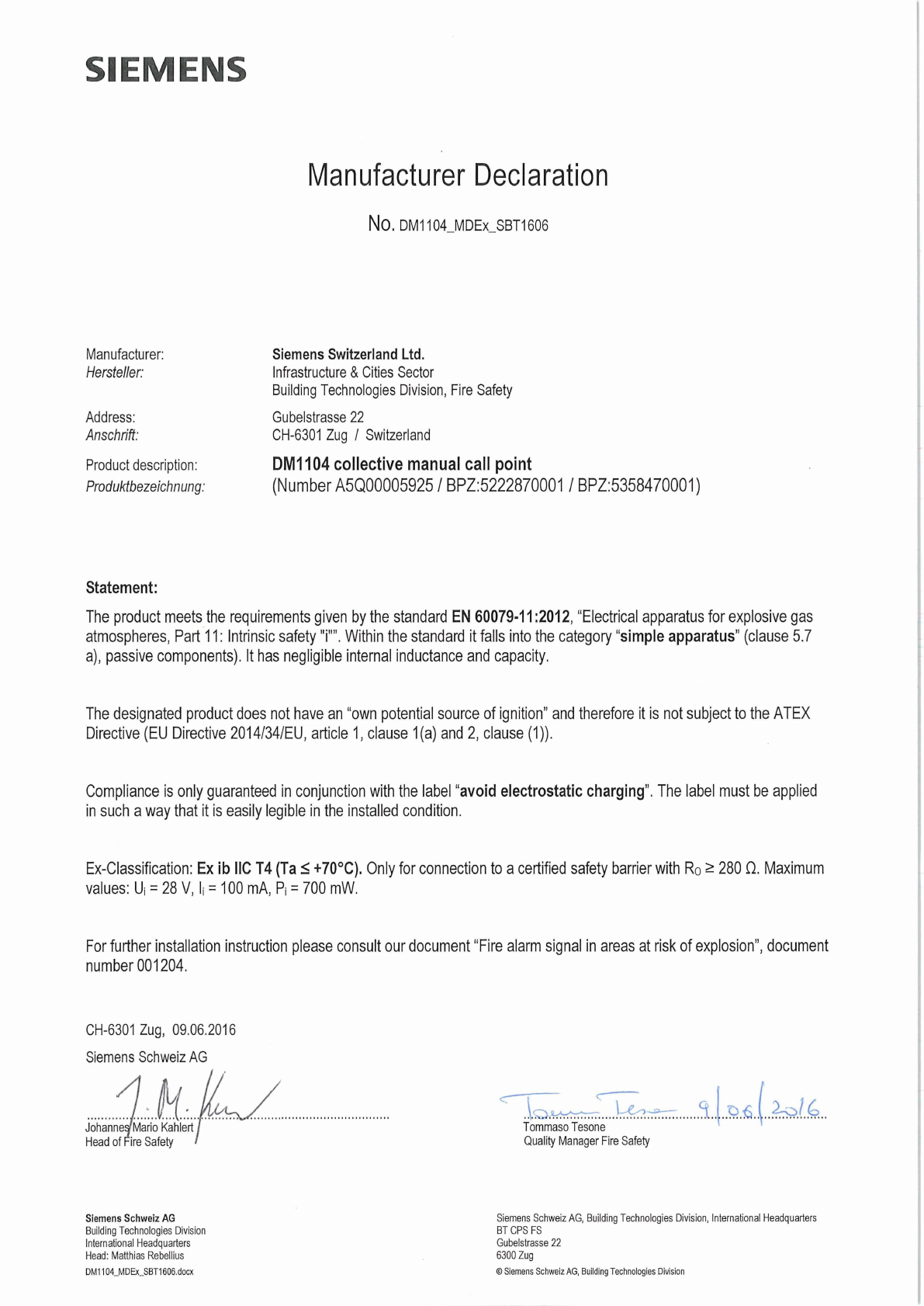 For further installation instruction please consult our document “Fire alarm Signal in areas at risk of explosion", document