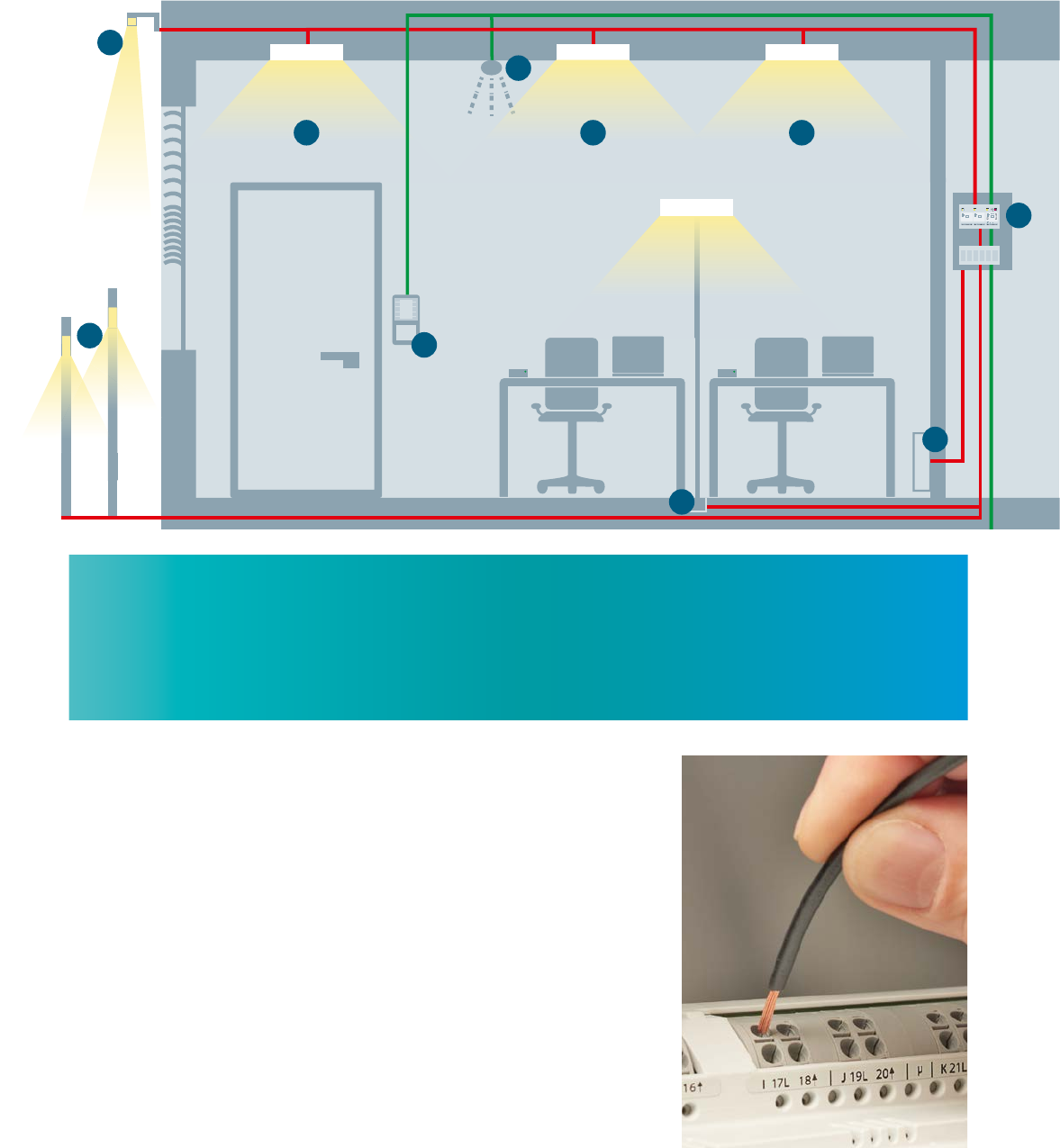 room via presence detectors (1) or push-buttons (4). Both workplace lighting and PCs/monitors are supplied with