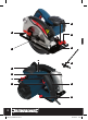 NL Productbeschrijving Het hanteren van de cirkelzaag • Houd de zaag tijdens gebruik met beide handen vast. 1 Zaagbladvergrendelingsschroef 2 Beschermkap terugtrekhendel 3 Afschuining vergrendelingsschroef 4 Geleider vergrendelingsschroef Ontkoppel de machine van de stroombron wanneer deze onbeheerd wordt achtergelaten. 5 Voetplaat Het maken van een zaagsnede 6 Parallelgeleider • Houdt de zaag stevig vast en rust de voorzijde van de voetplaat (5) op de rand van het werkstuk.