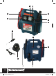 234578 Product Familiarisation 1 Work Light 2 Positive Clamp 3 Volt-Meter 4 Work Light Switch 5 Negative Clamp 6 Battery Test Button 7 Charging Socket 8 Pressure Gauge 9 Compressed Air Line 10 12V Cigarette Lighter Socket 11 Compressor Switch 12 230V Charger 13 12V Charging Lead Unpacking Your Tool • C arefully unpack and inspect your tool. Fully familiarise yourself with all its features and functions • Ensure that all parts of the tool are present and in good condition.