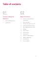 Table of contents 01 02 Custom-designed Features Basic Functions 6 Multi-tasking feature 8 quick share 10 Product components and accessories 11 Parts overview 13 Turning the power on or off 14 Inserting the memory card 15 Removing the memory card 16 Battery 20 Touch screen 23 Home screen 30 Screen lock 33 Memory card encryption 34 Taking screenshots 35 Entering text 40 Do not disturb 3