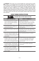 PROBLÈME CAUSE Le boyau à haute Aucune pression est trop long pression ou basse pression (à l'utilisation initiale) Aucun produit La baguette de pulvérisation chimique n’a pas de buse noire, n'est aspiré changez la buse Filtre de produit chimique obstrué Le produit chimique est trop épais Le boyau à haute pression est trop long Débris dans l’injecteur chimique Aucune pression ou basse pression (après un certain temps d'utilisation normale) Fuite d'eau au niveau de la connexion du pistolet/lance Fuite d'ea