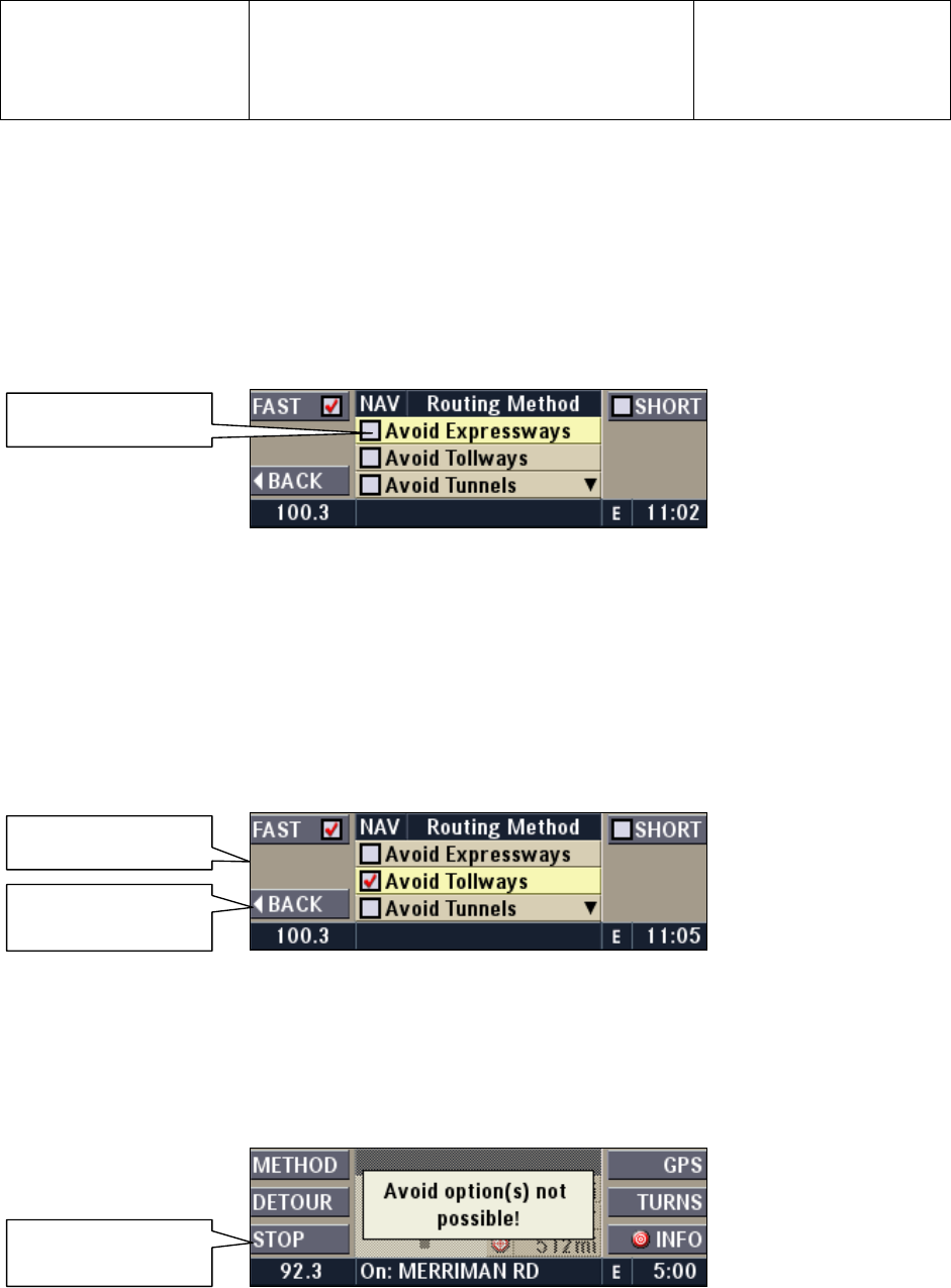 In case that the route cannot be calculated, a message will appear for 10 seconds. The avoid options will be