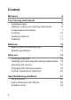 Content Welcome 4 Your hearing instruments Instrument type Getting to know your hearing instruments Components and names Controls Hearing programs Features 5 5 6 7 10 11 11 Batteries Battery size and handling tips Replacing batteries 12 12 13 Daily use 14 Turning on and off 14 Inserting and removing the hearing instruments 15 Adjusting the volume 19 Changing the hearing program 19 Further adjustments (optional) 20 Special listening situations On the pho