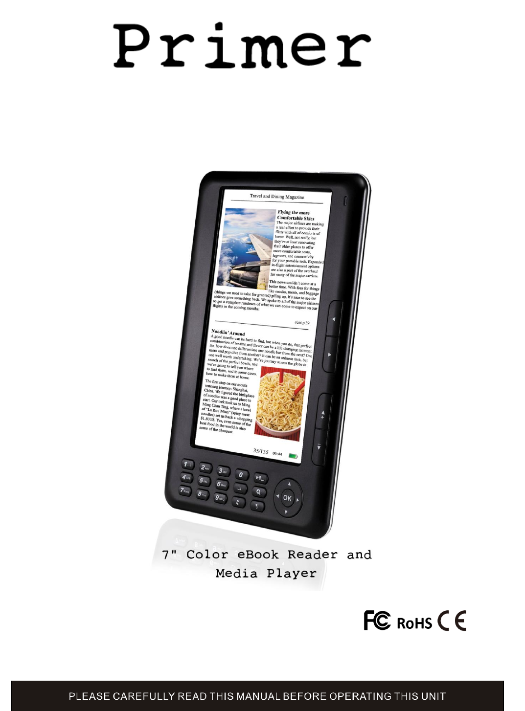 2). Transferring media and recharging: 1. Transferring media files Connect Primer to your computer via the included USB data cable. Your computer will recognize Primer as a mass storage device. Drag your eBook, music, and/or video files onto the device. Alternately, you can drag and drop your media files onto a micro SD card (up to 16GB) and insert your card into Primer’s SD card slot. Primer will automatically sort your files into the proper categories. 2. Recharging 1).