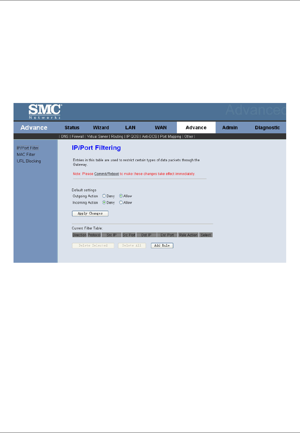 Click IP/Port Filter in the left bar to open the screen of Fig 3.6.2.1. Entries in this table are used to restrict