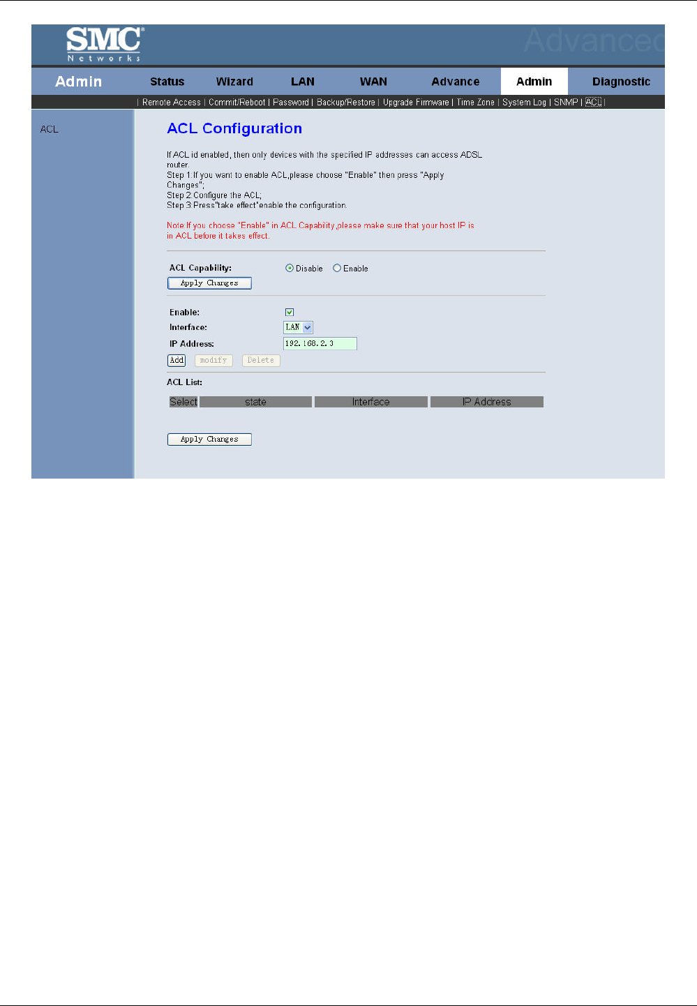 Note: If you check "Enable" in ACL Capability, please make sure that your host IP is in ACL List before it