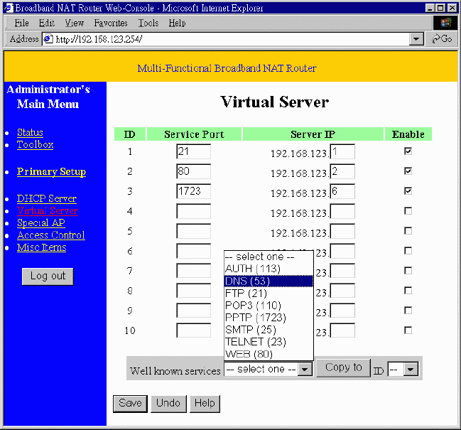 For example, if you have an FTP server (port 21) at 192.168.123.1, a Web server (port 80) at