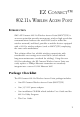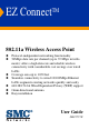EZ CONNECT™ 802.11A WIRELESS ACCESS POINT Please register this product and upgrade the product warranty at www.smc.com. Please inform your dealer if there are any incorrect, missing or damaged parts. If possible, retain the carton, including the original packing materials. Use them again to repack the product in case there is a need to return it. Hardware Description Ethernet Compatibility SMC’s Wireless Access Point can attach directly to 10BASE-T/ 100BASE-TX (twisted -pair) Ethernet LAN segments.