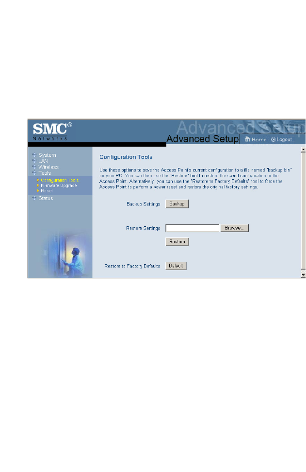 • Backup Settings – Saves the SMC2870W’s configuration to a