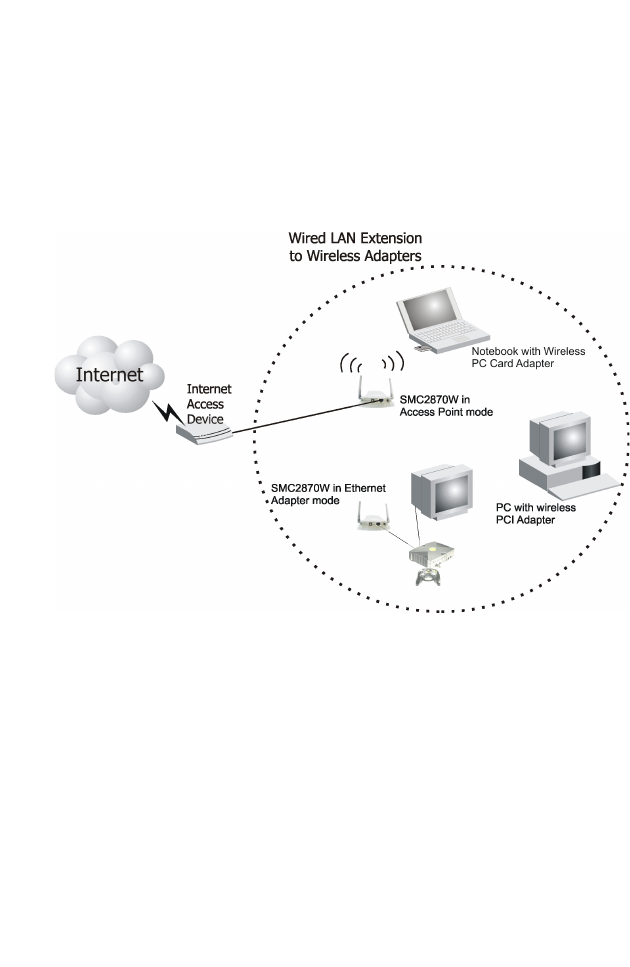 In this application one SMC2870W is in Client Bridge mode