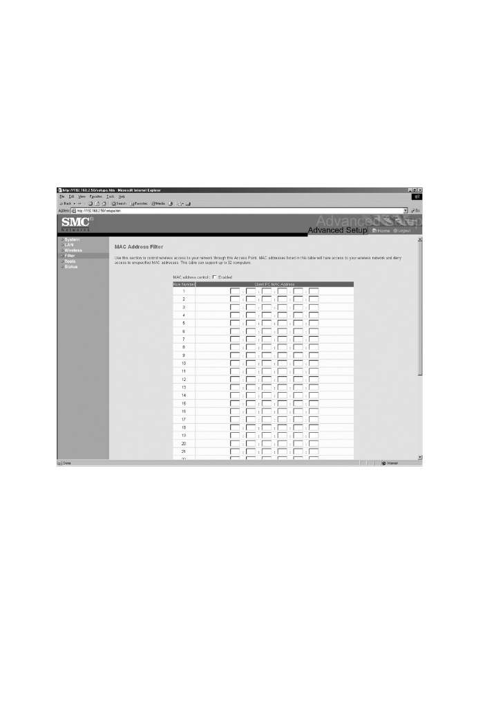 Nota: En la opción MAC Filtering (Filtraje de direcciones MAC)