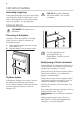 Om kylskåpet inte fungerar... Problem Möjlig orsak Åtgärd Produkten fungerar inte. Produkten är avstängd. Sätt på produkten. Stickkontakten sitter inte ordentligt i eluttaget. Sätt i stickkontakten ordentligt i eluttaget. Eluttaget är strömlöst. Anslut en annan elektrisk produkt till eluttaget. Kontakta en behörig elektriker. Produkten bullrar. Produkten står ostadigt. Kontrollera om produkten står stabilt. Ljudligt eller visuellt larm är på.