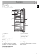 Description EN 2 Description 2.1 General Description 1 Control panel 2 Light 3 Fan 4 Refrigerator compartment 5 Defrost water outlet 6 Freezer compartment 7 Refrigerator door 8 Freezer door 2.2 Parts definition Control panel Interior lighting For setting the temperature inside the refrigerator and freezer compartments. The interior of the appliance is lit when the door is opened. Refrigerator compartment For storing fresh foods.