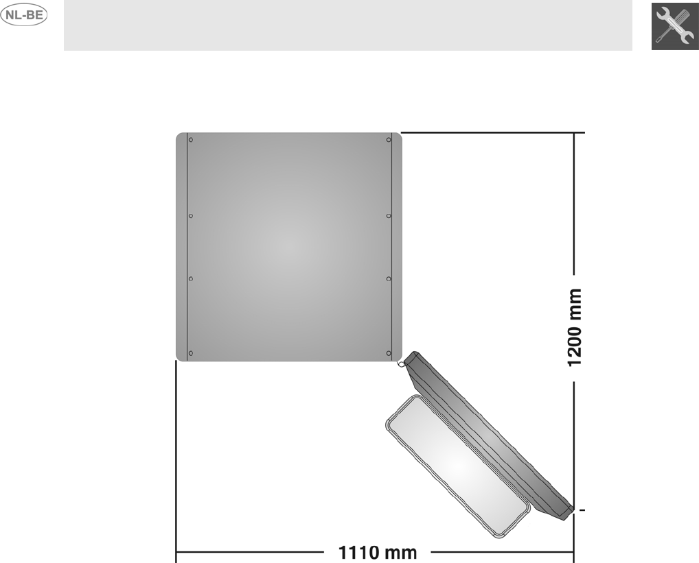 - In de onderstaande tekening staan de maximale buitenafmetingen aangegeven van het product met een geopende deur.