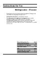 Instructions for Use Refrigerator - Freezer Thank you for your trust and for buying this appliance. We hope it will successfully serve the purpose for many years. Refrigerator with freezer is for domestic use only. The upper part of the appliance is refrigerator and is used for storing fresh foods at the temperature of 0°C and higher. The lower part is freezer and is used for freezing fresh foods and storing frozen foods for longer periods of time (up to one year, depending on the kind of foods you store).