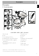 Description EN 2 Description 2.1 Product description 1 7 3 11 6 12 3 5 4 10 4 13 2 14 9 8 Model SMF02 - SMF03 - SMF13 - Stand Mixer 1 Motor head 2 Body 3 Power and speed selector 4 Head raising/lowering release button 5 Lower attachment shaft for supplied attachments 6 Front attachment hub for optional accessories 7 Front hub cover 8 Bowl base 9 Bowl** 10 Splash-proof pouring shield* 11 Dough hook 12 Flat beater 13 Wire whisk 14 Flex edges beater* *Standard only on certain models.