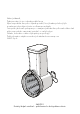 Použití • Nepripevňujte bubon priamo na kuchynský robot. Bubon musí byť vždy vložený do tela rotačného krájača a strúhača. • Čepeľ na bubne je ostrá. Pri práci buďte veľmi opatrní. • Prsty držte ďalej od otvorov. • Počas chodu prístroja sa nedotýkajte rotačného krájača a strúhača. • Nepoužívajte rotačný krájač a strúhač na iné účely, než je uvedené. 1. Potraviny, ktoré sa chystáte krájať alebo strúhať, narežte na také kúsky, ktoré budú dostatočne malé na to, aby prešli cez horný otvor tela strúhadla. 2.