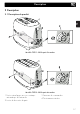 Description 2.2 Panneau de commandes 1. Bouton fonction de Décongélation 5. Touche de fonction Bagel Cette fonction est utile pour griller du pain congelé. Pendant le grillage, le bouton de Décongélation s’allume pour indiquer que le cycle de grillage est actif. Cette fonction permet de griller un seul côté du bagel ou tout autre type de pain sans griller l'autre. Pendant le grillage, le bouton Bagel s’allume pour indiquer que la fonction est active. 2.