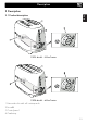 Description 2.2 Control panel 1. Defrost function button 5. Bagel function button This function is useful when using frozen bread. During toasting the defrost button will light up to indicate that the cycle is activated. This feature will toast one side of the bagel or any other kind of bread, without toasting the other side. During toasting the Bagel button will light up to indicate that the function has been activated. 2.