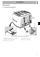 Limpieza y mantenimiento 4.5 Limpieza de las bandejas recogemigas La tostadora está equipada con dos bandejas recogemigas, uno para cada par de compartimentos. Para limpiar la bandeja recogemigas proceda como sigue: 1. Presione la bandeja recogemigas para desbloquearla y luego tire para extraerla y vaciarla. Vacíe la bandeja recogemigas después de cada uso. 2. Vuelva a colocar la bandeja recogemigas en la tostadora. Presione hasta que haga tope en su posición.