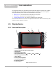Introduction Display Device 2.1.2 Technical Specifications Processor: Intel Atom Z530P 1.6GHz Operating System Microsoft Windows Embedded Standard SP3 Touch Screen Resistive Touch Panel Display: 10.2 inch diagonal, LCD TFT 1024 x 600 resolution WSVGA 16 bit color Battery: Lithium Ion Smart Battery Pack Approximate 4 hour run time Approximate 4 hour charge time (with or without unit operating) DC Jack Operating Voltage 10V to 32V DC Communications: 802.11 b/g/n Wireless Bluetooth 2.