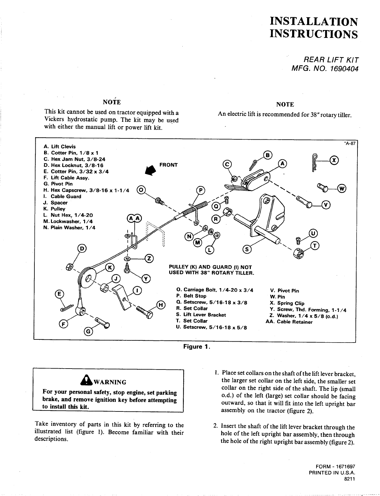 INSTALLATION INSTRUCTIONS REAR LIFT KIT MFG. NO. 1690404 NOTE NOTE This kit cannot be used on tractor equipped with a An electric lift is recommended for 38 rotary tiller. Nickers hydro static pump. The kit may be used with either the manual lift or power lift kit. ZgrxerzpmmpoRy . Hex Lockout, FRONT . Cotter Pin, 3/32x 3/4 ‘ . Lift Cable Says. . Hex Cap screw, x -1/ () Cable Guard Spacer . Lock washer, 1/4 .