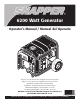 6200 Watt Generator Operator’s Manual / Manual del Operario Snapper™ is a licensed trademark of Briggs & Stratton Power Products. Snapper™ se usa abajo licencia a Briggs & Stratton Power Products. Questions? Help is just a moment away! Preguntas? La ayuda es justa un momento lejos! Call: Generator Helpline - 1-800-317-7833 M-F 8-5 CT Llamada: Generador Helpline - 1-800-317-7833 M-F 8-5 CT BRIGGS & STRATTON POWER PRODUCTS GROUP, LLC JEFFERSON,WISCONSIN, U.S.A. Model No.