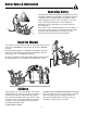 Operation GENERAL OPERATION WARNING This unit is a “two-stage” snowthrower. CHECKS BEFORE EACH START-UP The first stage is the auger, which feeds the snow back into the impeller housing. The second stage is the impeller, which throws the snow out the discharge chute. If bodily contact is made with the auger or impeller when they are rotating, severe personal injury will occur. 1. Make sure all safety guards are in place and all nuts, bolts and clips are secure. 2.