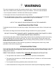 WARNING This cab is designed to provide foul weather protection only. It does not provide protection from noise, exhaust fumes, chemicals or injury from collision, roll-over or other accidents. 1. Do not operate machine in confined areas without proper ventilation 2. Thoroughly check area of operation before using machine 3. The cab adds height to the machine.