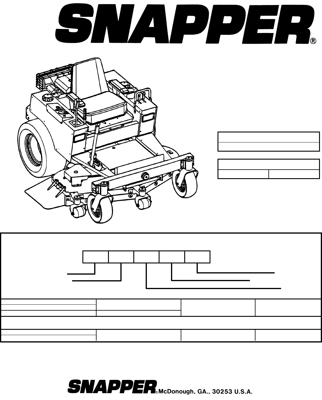 Safety Instructions & Operator’s Manual for MID MOUNT Z-RIDER ZERO TURNING HYDRO DRIVE SERIES 1 IMPORTANT Snapper products are built using engines that meet or exceed all applicable emissions requirements on the date manufactured. The labels on those engines contain very important emissions information and critical safety warnings. Read, Understand, and Follow all warnings and instructions in this manual, the engine manual, and on the machine, engine and attachments.