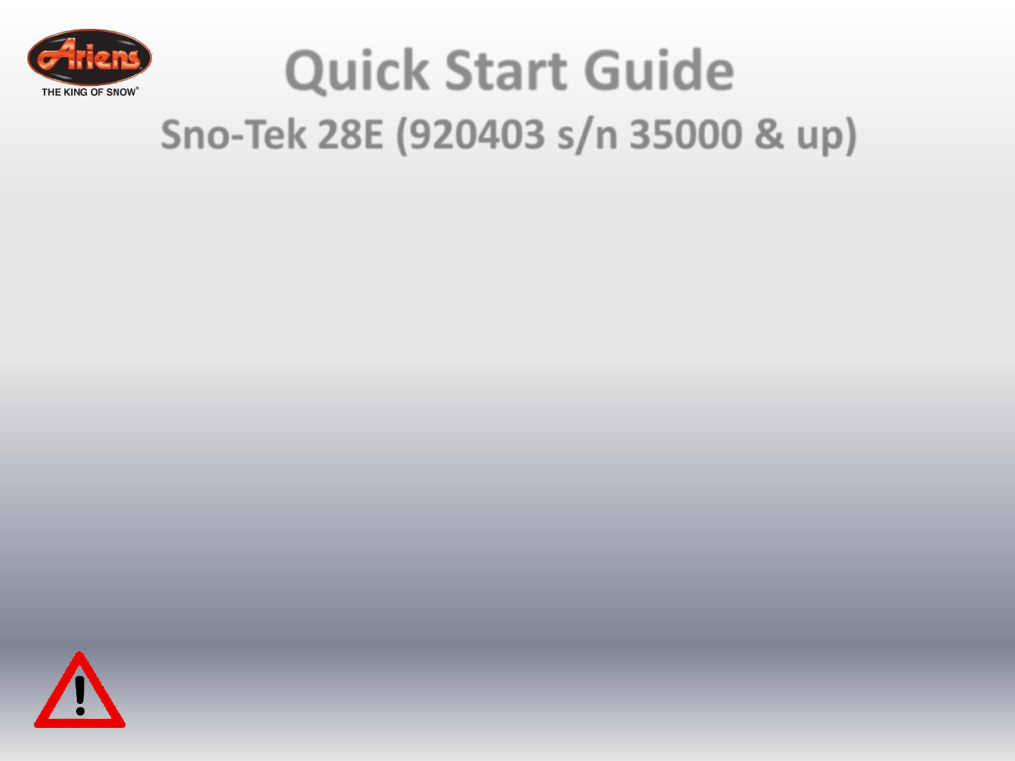 Quick Start Guide Sno-Tek 28E (920403 s/n 35000 & up) • • • • • • • • • • • Step 1: Unfold Handlebar Step 2: Install Discharge Chute Step 3: Install Discharge Chute Crank Step 4: Install Remote Deflector Cable Step 5: Check Function of Dual Handle Interlock Step 6: Check Tire Pressure Step 7: Check Auger Gearcase Oil Step 8: Check Engine Crankcase Oil Step 9: Fill Engine Fuel Tank Step 10: Start Engine Step 11: Stop Engine READ AND UNDERSTAND ALL INSTRUCTION, WARNING, AND DANGER LABELS.