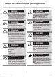1. About this installation and operating manual The following mandatory signs inform the user that actions are required. The requirements described must be complied with. 1.7 Information regarding the depiction of text 1. WARNING Risk of eye injury! Chips flying when drilling may cause serious injuries to eyes and hands. ► Wear safety glasses. WARNING Risk of injury in the head region! Impact with suspended objects may cause serious abrasions and cuts. ► Wear a safety helmet.
