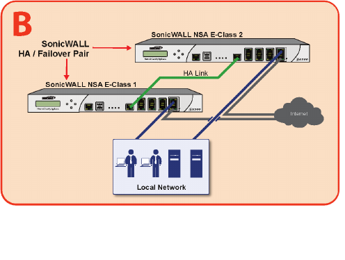 - For network installations with two SonicWALL NSA E-Series appliances configured as a stateful synchronized pair for redundant high-availability networking.
