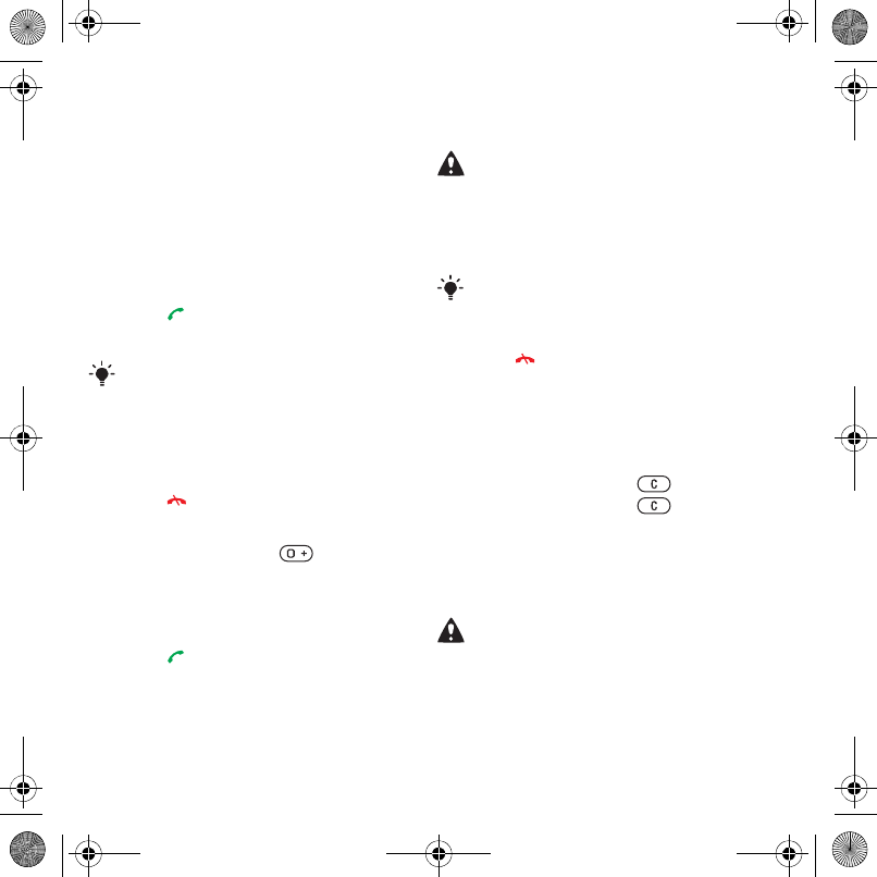 (ULNDB8*B3$ ERRN 3DJH )ULGD\ $XJXVW 30 Calling Making and receiving calls You need to turn on your phone and be within range of a network. To make a call 1 From standby enter a phone number (with international country code and area code, if applicable). 2 Press . You can call numbers from your contacts and call list. See Contacts on page 23, and Call list on page 27. You can also use your voice to make calls. See Voice control on page 28. To end a call • Press .