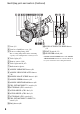 Identifying parts and controls (Continued) A Lens (21) B Lens hood with lens cover (21) T PUSH AUTO/FOCUS HOLD button (32) C Front recording lamp (100) U FOCUS switch (32) The recording lamp flashes if the remaining capacity of recording media or battery is low.