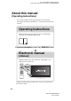 C:\Users\ming\Desktop\Group A6 (Rev4)\4411972141\4411972141\4411972141_GB\GB01TOC.fm About this manual (Operating Instructions) This manual explains how to set up your TV. For more information on how to use BRAVIA TV, refer to the “Electronic manual”. Operating Instructions Explains how to set up your TV such as connections, initial set-up, and basic operations. For more information, press the i-MANUAL button Electronic manual (i-Manual) Explains how to use all the features.