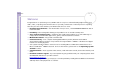 Sony Notebook User Guide Glossary n N 119 Glossary This section refers to terms used in this manual. These terms and definitions have been compiled to provide you with a better understanding of your VAIO computer. Term Definition key The key gives you access to the online help of most software. 10BASE-T/100BASE-TX Ethernet system providing data transfer rates of 10 Mbps (megabits per second) and 100 Mbps. The 100BASE-TX is a very direct derivative of 10BASE-T.