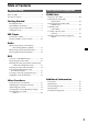 Table of Contents This Unit Only With Optional Equipment Notes on MDs .......................................................... 4 Location of controls ................................................. 5 Getting Started Resetting the unit ................................................ Detaching the front panel .................................. Preparing the rotary commander ..................... Setting the clock ..................................................