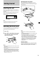 Attaching the front panel Getting Started Place the hole a in the front panel onto the spindle b on the unit as illustrated, then push the left side in. Resetting the unit a b Before operating the unit for the first time or after replacing the car battery, you must reset the unit. Remove the front pannel and press the reset button with a pointed object, such as a ballpoint pen. Reset button µ Note Pressing the reset button will erase the clock setting and some memorised functions.
