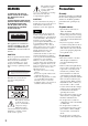 • • • • be operated in a horizontal position only. Keep the recorder, discs, and cassettes away from equipment with strong magnets, such as microwave ovens, or large loudspeakers. Do not place heavy objects on the recorder. To prevent fire or shock hazard, do not place objects filled with liquids, such as vases, on the apparatus. When you move the recorder, take out any discs. If you do not, the disc may be damaged.