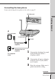 Connecting the base phone If you want to hang the base phone on the wall, see page 37. Hook the cord. Getting Started 3 2 To an AC outlet To DC IN 10 V To LINE AC power adaptor (supplied) 1 Telephone line cord (supplied) 1 To a telephone outlet 2 3 Connect the telephone line cord to the LINE jack, and to a telephone outlet. Connect the AC power adaptor to the DC IN 10 V jack, and to an AC outlet. Raise the antenna. Make sure it points toward the ceiling.
