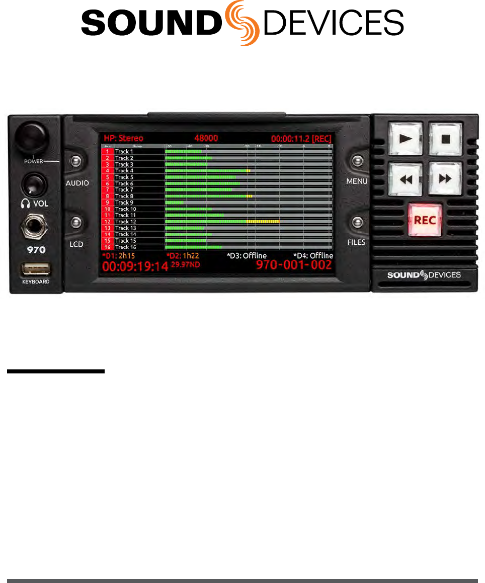970 Rack Mount Production Audio Recorder User Guide Firmware rev. 2.10 E7556 State Rd. 23 and 33, Reedsburg, WI, USA +1 (608) 524-0625 • Toll-Free: (800) 505-0625 • fax: +1 (608) 524-0655 www.sounddevices.com support@sounddevices.